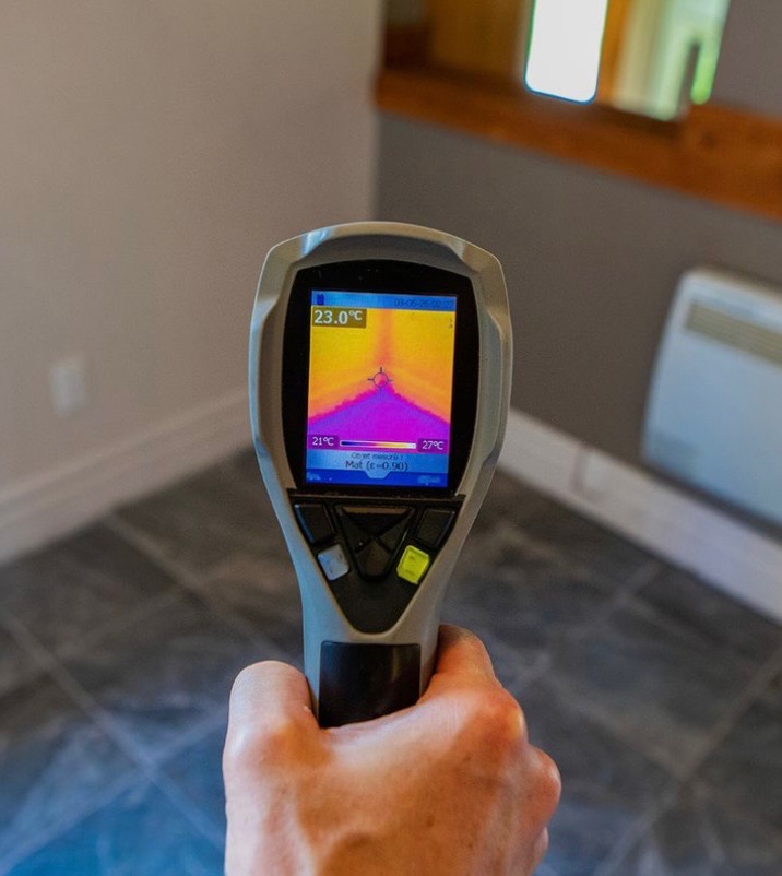 A non-invasive inspection using a thermal imaging device to detect temperature variations, helping identify hidden moisture, insulation gaps, or other potential issues not visible to the naked eye.